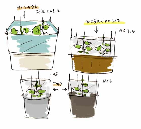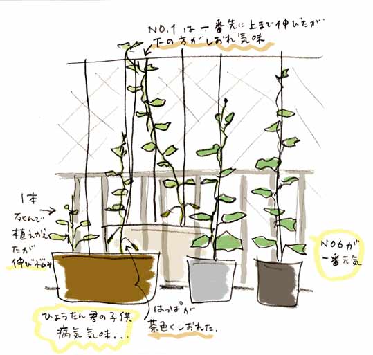 5/27(金)曇り ゴールデンウィークの暑い日に一斉に芽を出したひょうたん君達。今年はナメクジ対策をしていたので、ナメクジの被害にあうこともなく順調に伸びています。 しいていえば、5月の日照不足が影響してなんだか成長が遅いような・・・ サカタの種と去年収穫のひょうたん君の子供、どっちの成長が良いかと申しますと、去年のひょうたん君の子供のほうが、幾分元気みたい・・・発芽率はどちらも50%です。