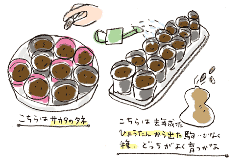 4/14(金)曇り サカタのたねと、去年成ったひょうたん君の子供と2種類を撒いて競わせることにした。サカタのたねは色が白っぽくてきれいだけど、ひょうたん君のほうがちょっと大きい。さてどっちが大きく育つでしょうか。 それにしてもあんまり寒いとなかなか発芽しないんですよね。温室に置いて様子見る。 これまでの教訓でもうナメクジには近寄らせないし、肥料のあげすぎも注意だし、今年の私は違いますよ〜! |