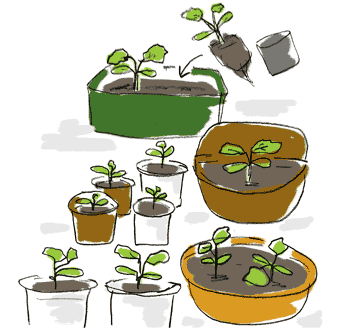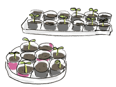 双葉から本葉が出てきたので、そろそろポットから移植しようかな、と思うのですが、まだヒゲが出るまでは風に弱く、寒い日も多いし、ベランダにあるプランターにはちと早い。と、言う訳でしばらくは小さいプランターに植え替えて温室におくことに。 1個だけあったshop99で買ったプランターと同じものを買いに走ったら、ない!!仕方なくその辺にあった鉢という鉢に移植してみました。育ち具合の順に大きめの鉢から、最後はそんなにポットと変わってないんじゃないの?って小さな鉢まで。 この中からまた5、6本の選抜になるのであります。すでに1本だけ、鉢がないからさよならしました。