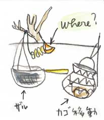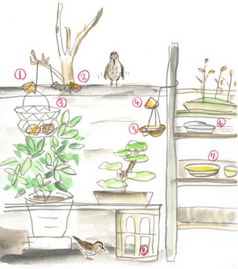 1.オレンジ 2.ピーナツ、フライドチキン、オレンジ 、ドライフルーツ(ジャックフルーツ) 3.オレンジ、パン 4.オレンジ、プルーン 5.牛脂 6.カナリヤのエサ 7.水 8.梅もどきの実つき枯れ枝